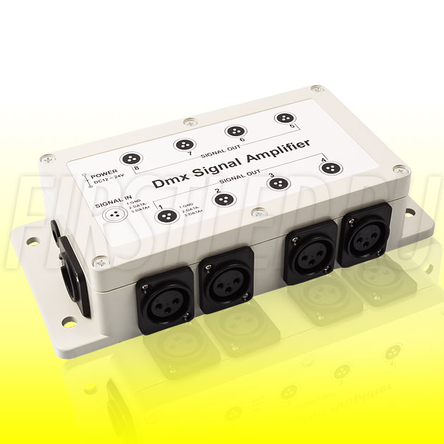 Если на определенном расстоянии сигнал от DMX контроллера начинает пропадать, или приемник расположен слишком далеко – это значит что нужно использовать DMX усилители. Они служат для усиления сигнала от контроллера до декодера.