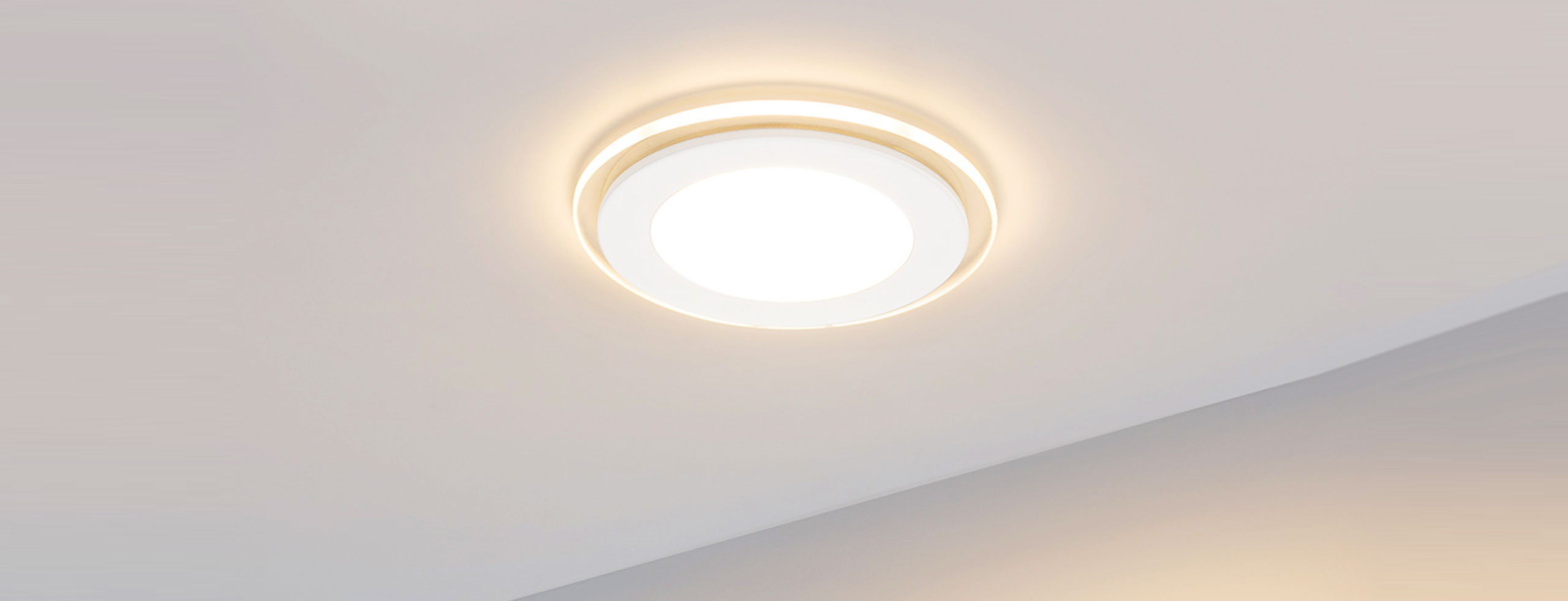 Благодаря стеклянной рамки с контурным свечением вокруг светильника создаются необычные световые эффекты на поверхности потолка.