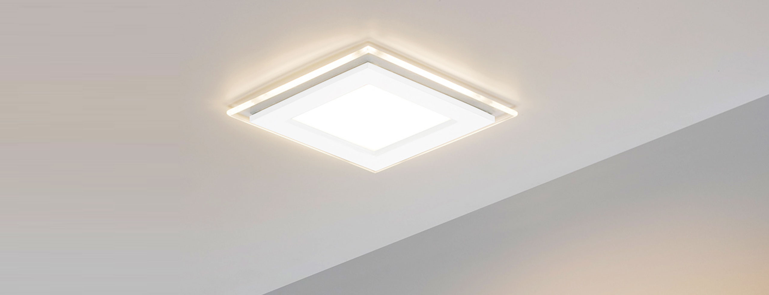 Благодаря стеклянной рамки с контурным свечением вокруг светильника создаются необычные световые эффекты на поверхности потолка.