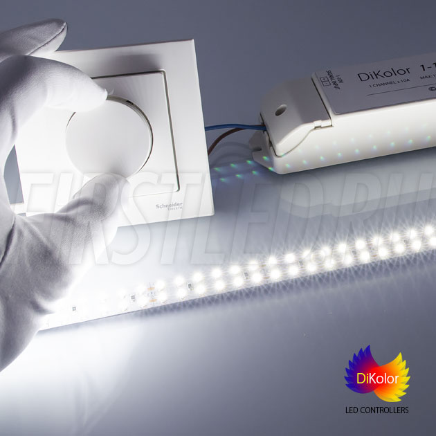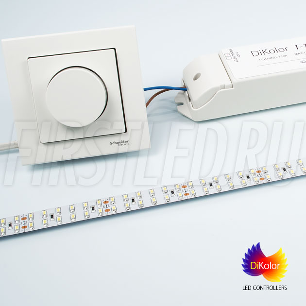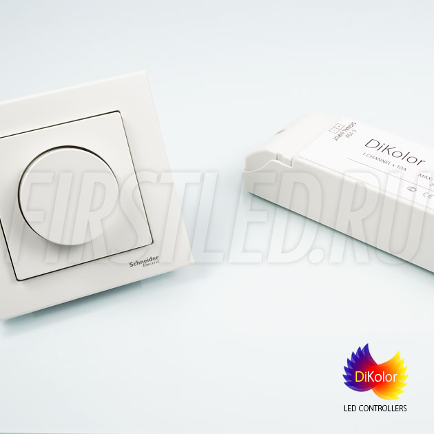 Поворотный диммер подключается к светодиодному контроллеру DiKolor 1-10V, к которому непосредственно подключается одноцветная светодиодная лента 12/24V.