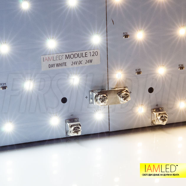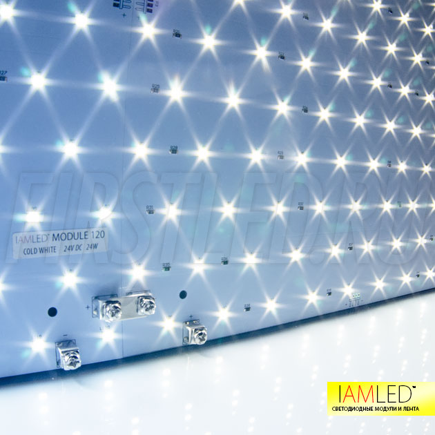 Яркость одного модуля — 2400 Люмен, а потребляемая мощность всего 24 Ватта! Модули подключаются к источнику питания 24V.