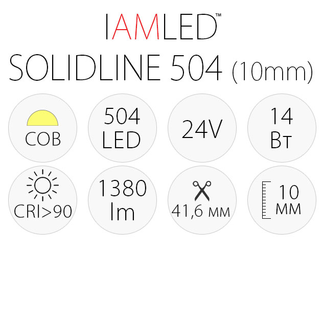 Сплошная светодиодная лента с эффектом размытия точек светодиодов – это светодиодная лента IAMLED SOLIDLINE 504 (10 mm). Предназначена для равномерной сплошной засветки.