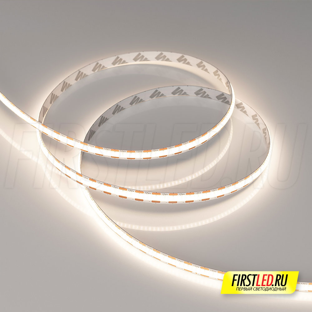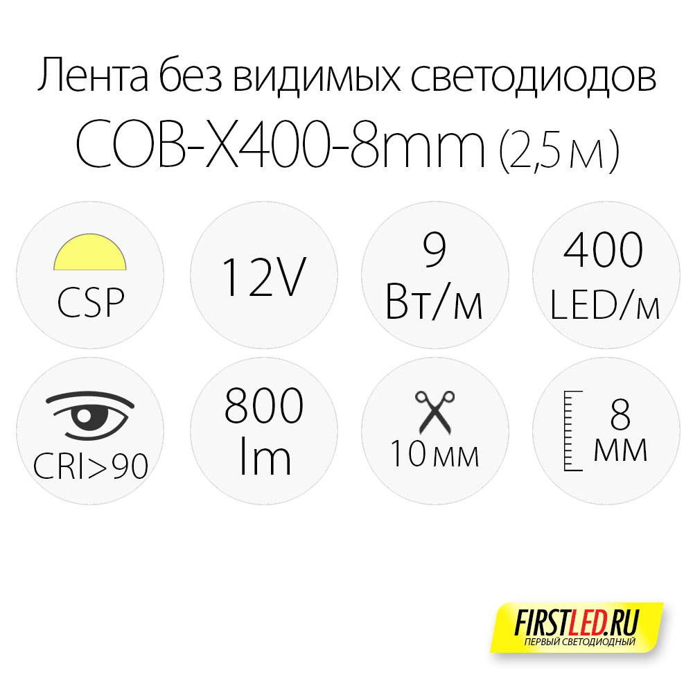 Светодиодные кристаллы типа CSP 400 шт/метр, питание 12V, потребляемая мощность 9 Ватт / метр. Высокая цветопередача CRI>90 и широкий угол света 170°, ширина ленты 8 мм, а максимальный световой поток составляет около 800 Люмен на 1 метр.