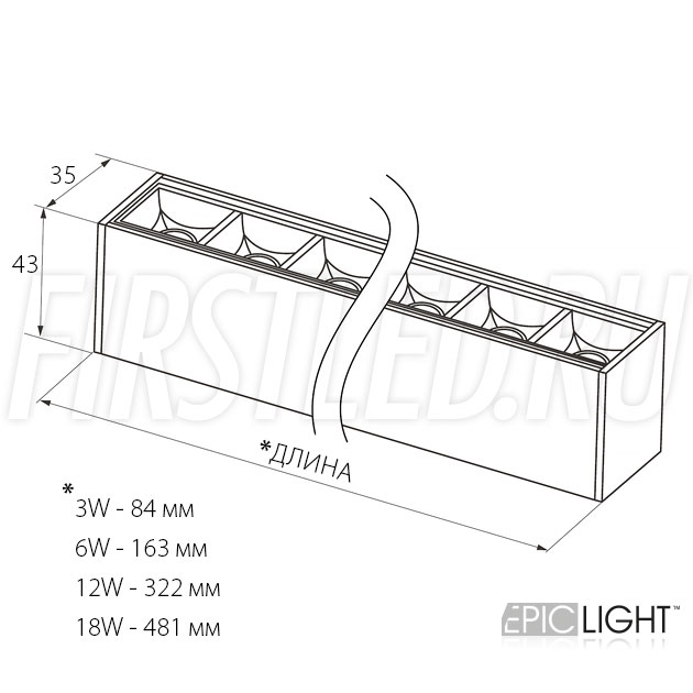 Доступны 4 модели светильников разной длины и мощности: 3Вт (84 мм), 6Вт (163 мм), 12Вт (322 мм) и 18Вт (481 мм).