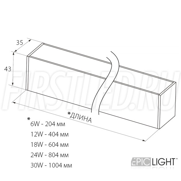Доступны 5 моделей светильников разной длины и мощности: 6Вт (204 мм), 12Вт (404 мм), 18Вт (604 мм), 24Вт (804 мм) и 30Вт (1м).