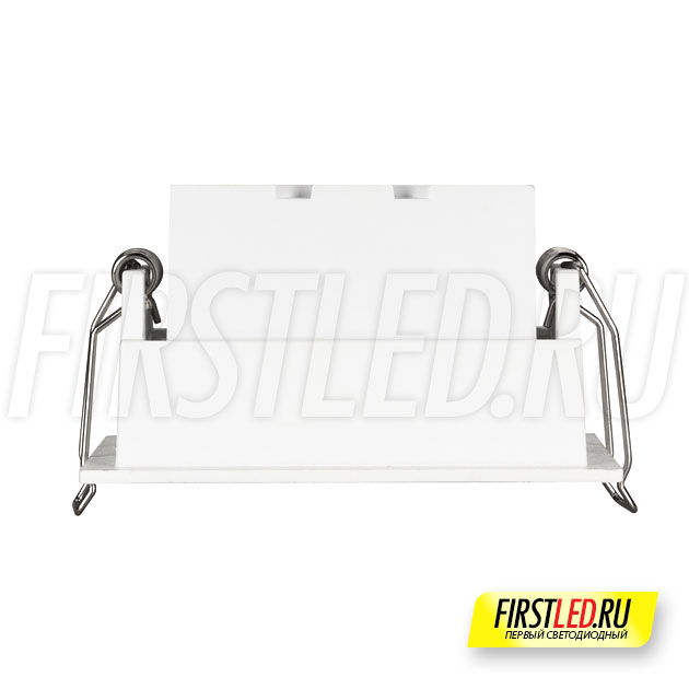 Светильник устанавливается в подвесной гипсокартонный потолок. Тонкая декоративная рамка белого цвета скрывает неровности отверстия при монтаже. Направленный световой поток светильника создает равномерное освещение. При повороте светового модуля на стену возникает дополнительный объем в интерьере.