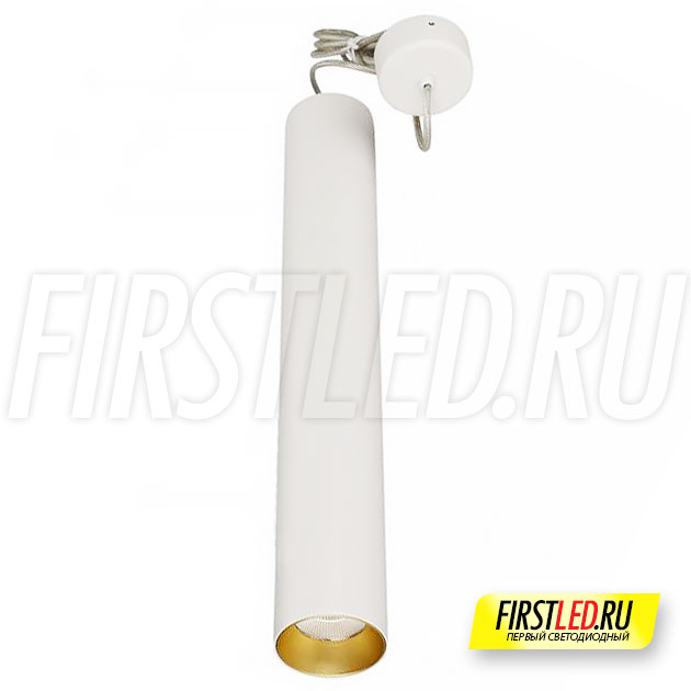 Вытянутый, длинный и узкий подвесной светодиодный светильник на потолок POLONIUM SL White 8W выполнен в белом алюминиевом корпусе длиной 450 мм с декоративной вставкой на выбор: золотой, черный или белый.