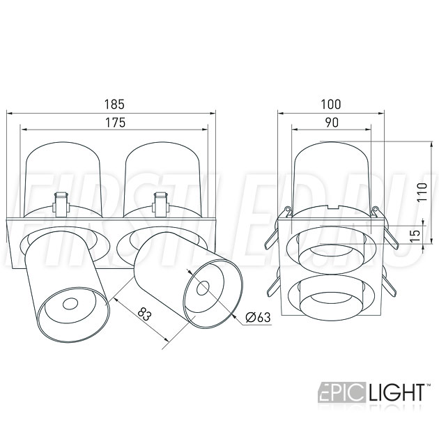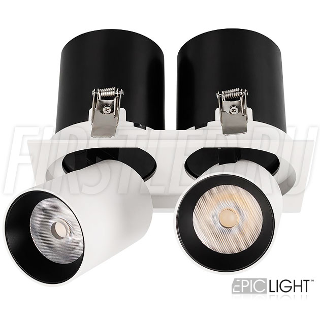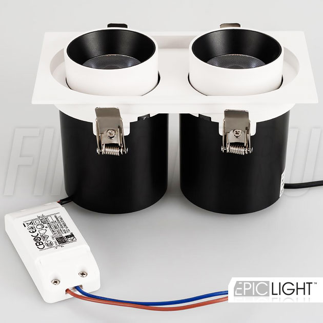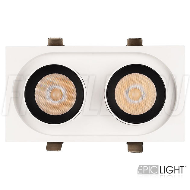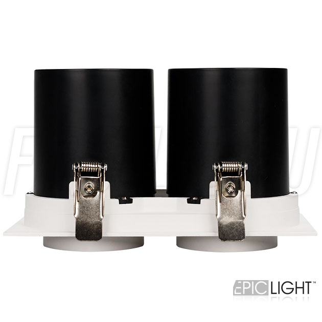 Светильник выполнен в прямоугольной рамке и окрашен в белый цвет с черными вставками. Простая установка в потолок благодаря пружинному механизму. Узкий (направленный) угол света в 20°.