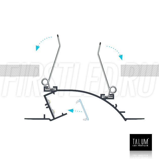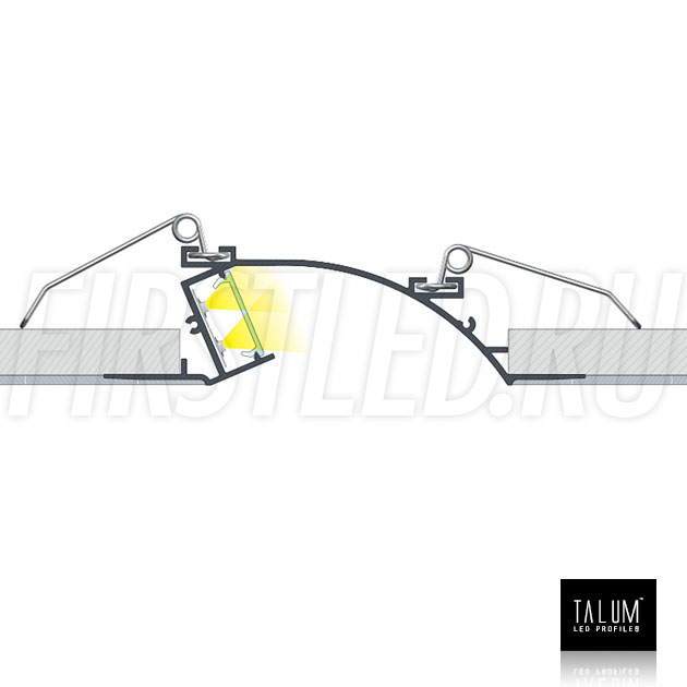Фигурный профиль без рамок TALUM NOFRAME S.124 с уникальной формой образующей на потолке вогнутый полукруг. Благодаря необычной форме мягкий отраженный свет распространяется по полукругу освещая интерьер.