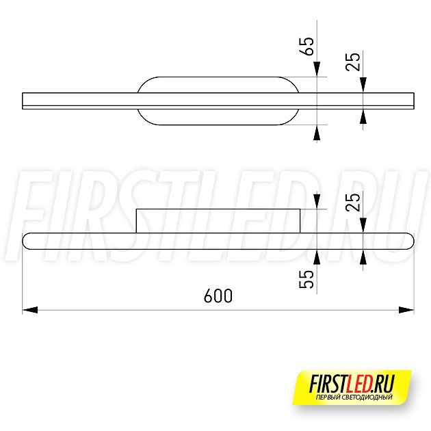 Световой поток светильника направлен вниз. Корпус и основание выполнены из алюминия и окрашены в черный цвет, матовый рассеиватель позволяет получить мягкий рассеянный свет. Длина корпуса составляет 600 мм.